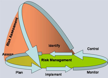 For the sake of the presentation within this site, the assumption is made, that the Risk Management life-cycle presented in the figure (i.e. plan, implement, monitor, control, identify, assess), refers solely to risks. Similar activities that might be necessary within the Information Security Management process are considered to apply to operational aspects related to the implementation and control of security measurements (see also ISMS scope).